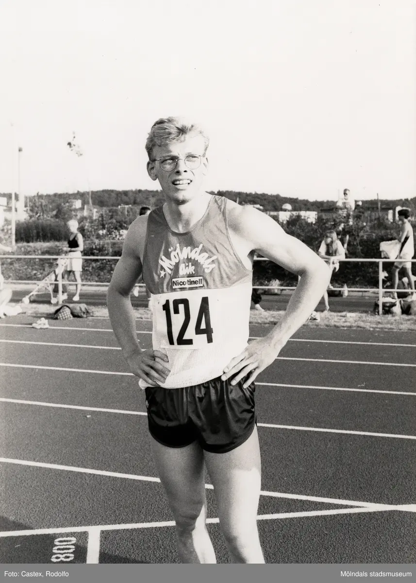 Porträtt av löparen Niklas Wallenlind från Mölndals AIK, Maik. Fotografi taget i början av 1990-talet. Idrottsanläggning okänd.