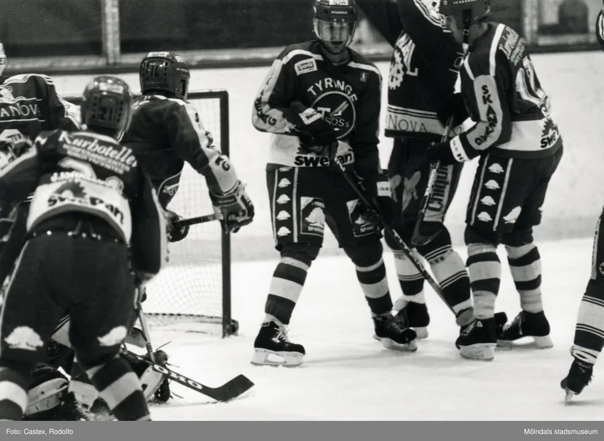 Ishockeymatch mellan IF Mölndal Hockey och Tyringe SoSS i Åby ishall, Idrottsvägen 5 i Åby, Mölndal, år 1987-1988.
