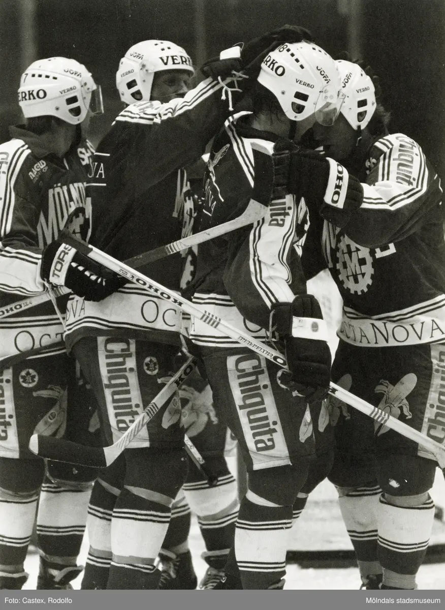 IF Mölndal Hockey spelar match i Åby ishall, Idrottsvägen 5 i Åby, Mölndal, okänt årtal. Även motståndarlag och slutresultat är okända.
