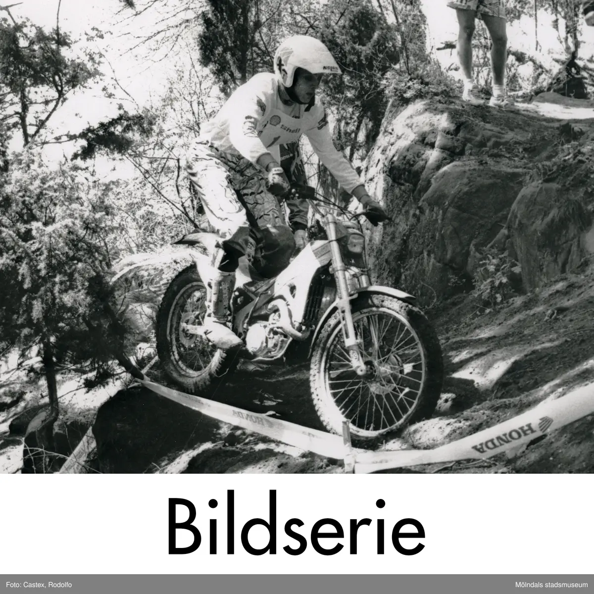 Serie om tre svartvita fotografier som visar trial vid Blixåsbanan i Balltorp, Mölndal, år 1992.