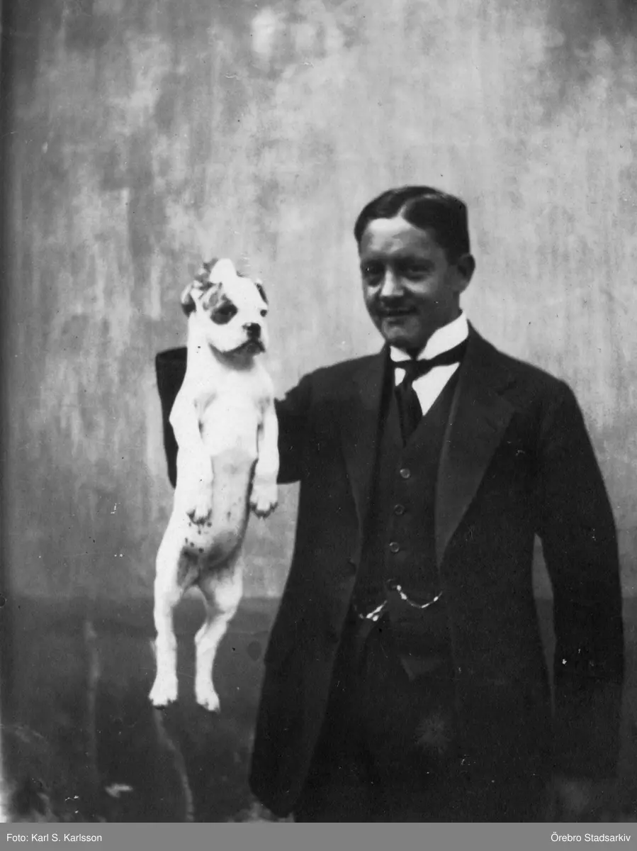 Man håller hundvalp i nackskinnet, 1912