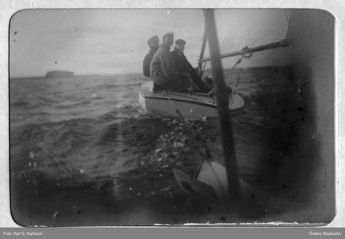 Tre unga män seglar på Hjälmaren, 1912