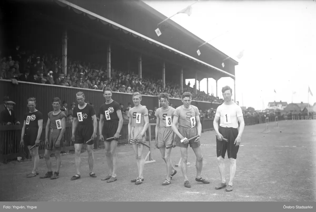 Löpare i stafettävling vid startlinjen på Eyravallen, 1920-tal