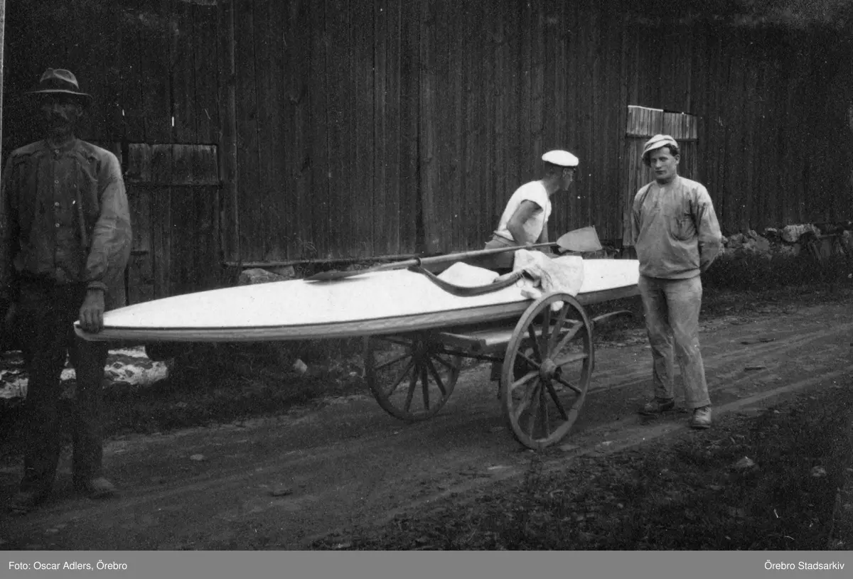 Vägtransport av kajak förbi Spånga kvarn, Västra Vingåker, 1921