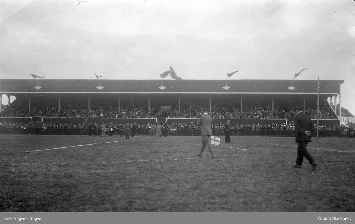 Läktaren på Eyravallen full med besökare, 1920-tal