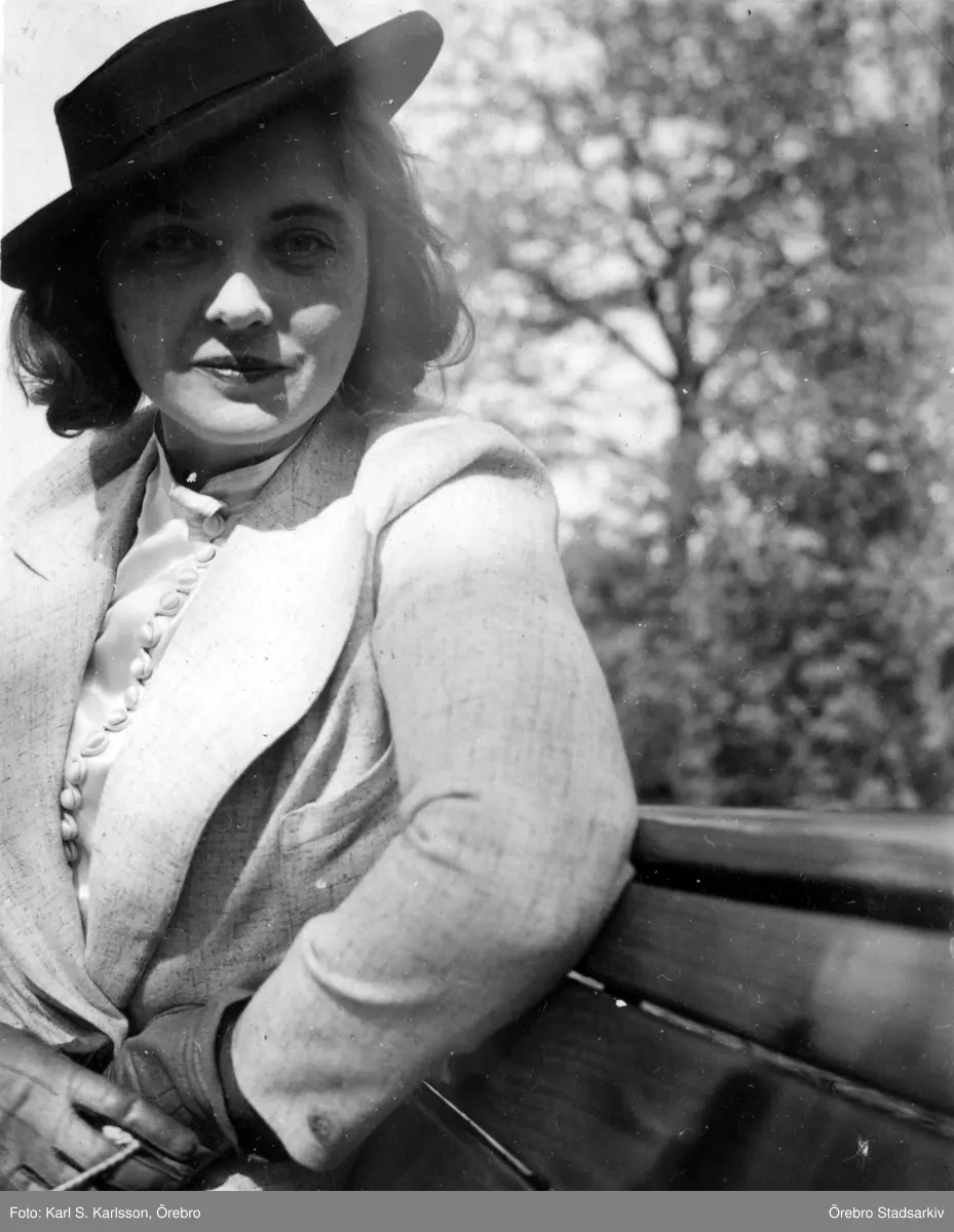 Välklädd kvinna på parkbänk i Hagaparken, 1936