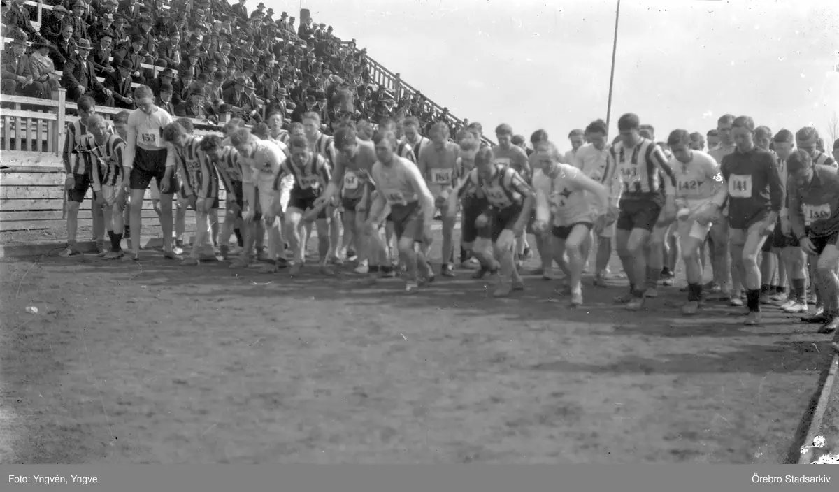 Löpare på startlinjen vid Örnsro idrottsplats, 1910-tal