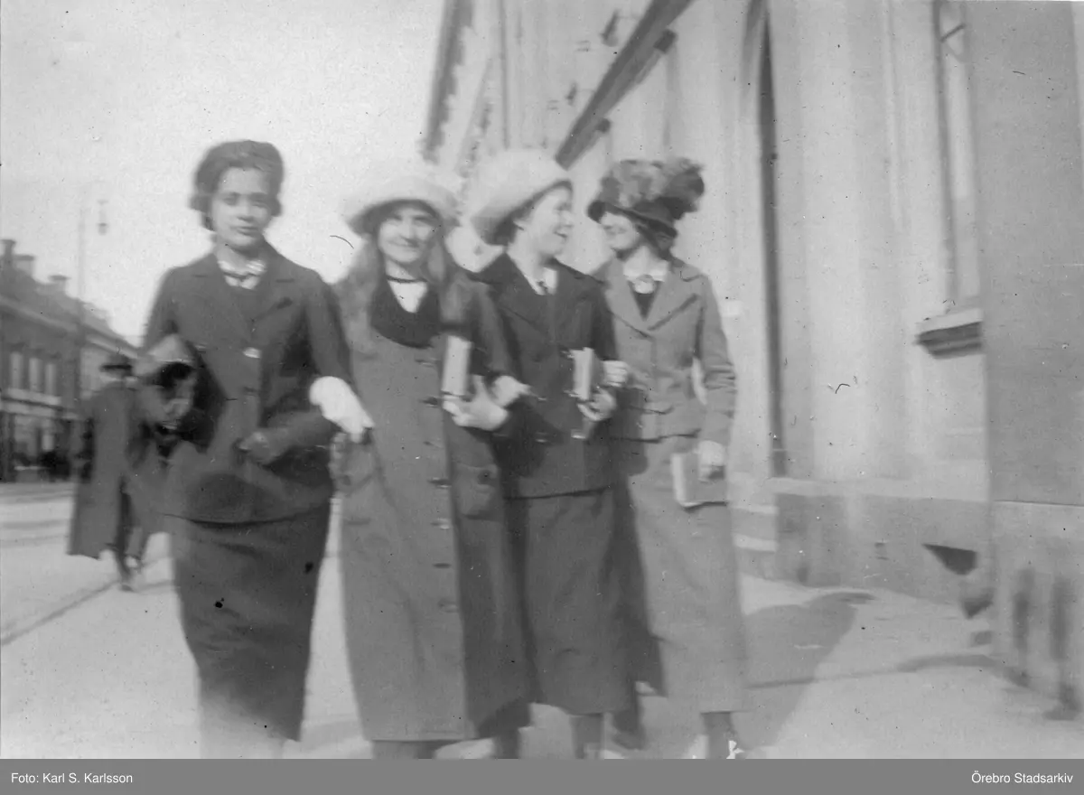 Fyra unga väninnor i armkrok på Drottninggatan, 1913