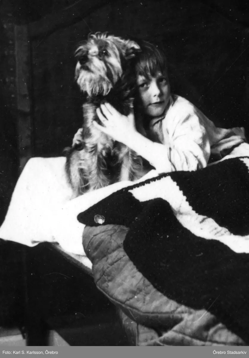 Barn och hund i sängen, Hjortstorpsvägen 9, 1936
