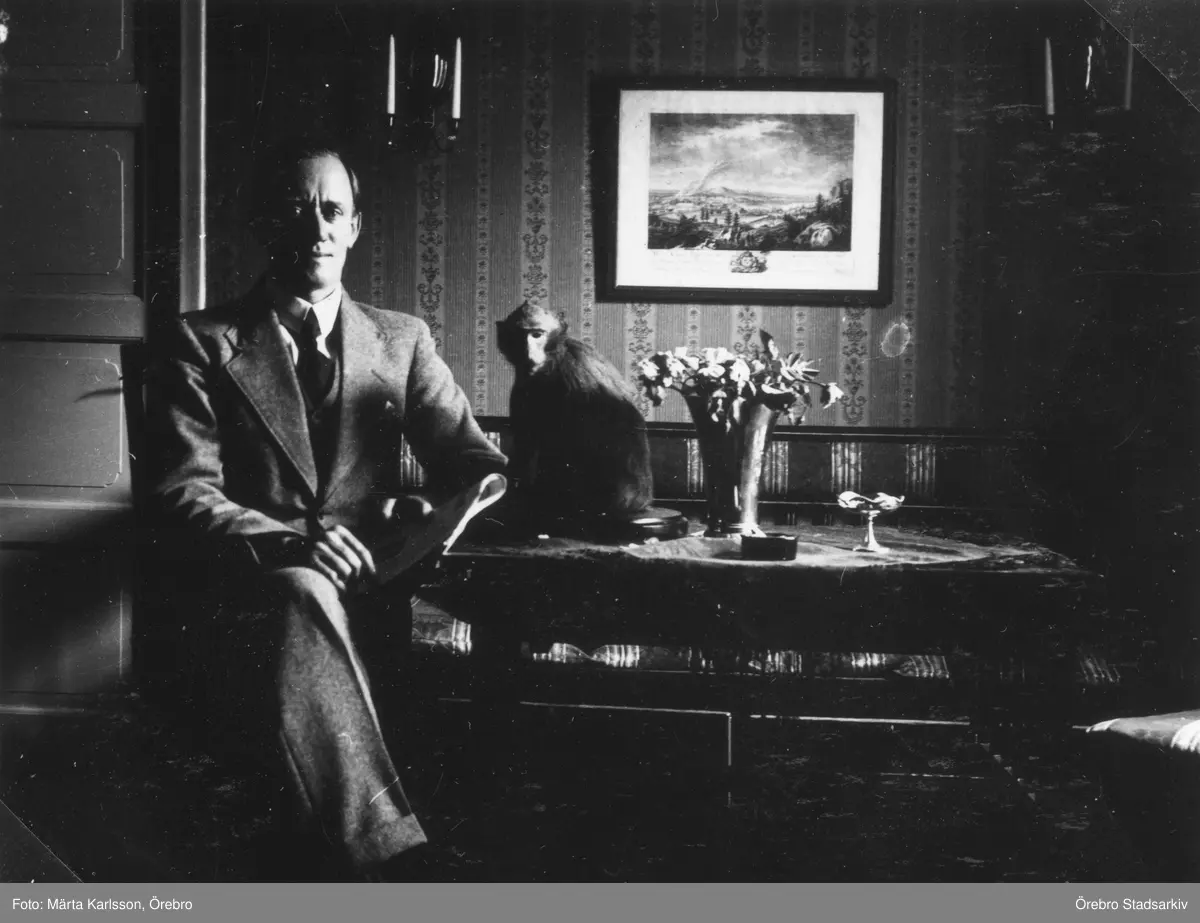Karl Karlsson med sin apan Mary på Hjortstorpsvägen, 1936
