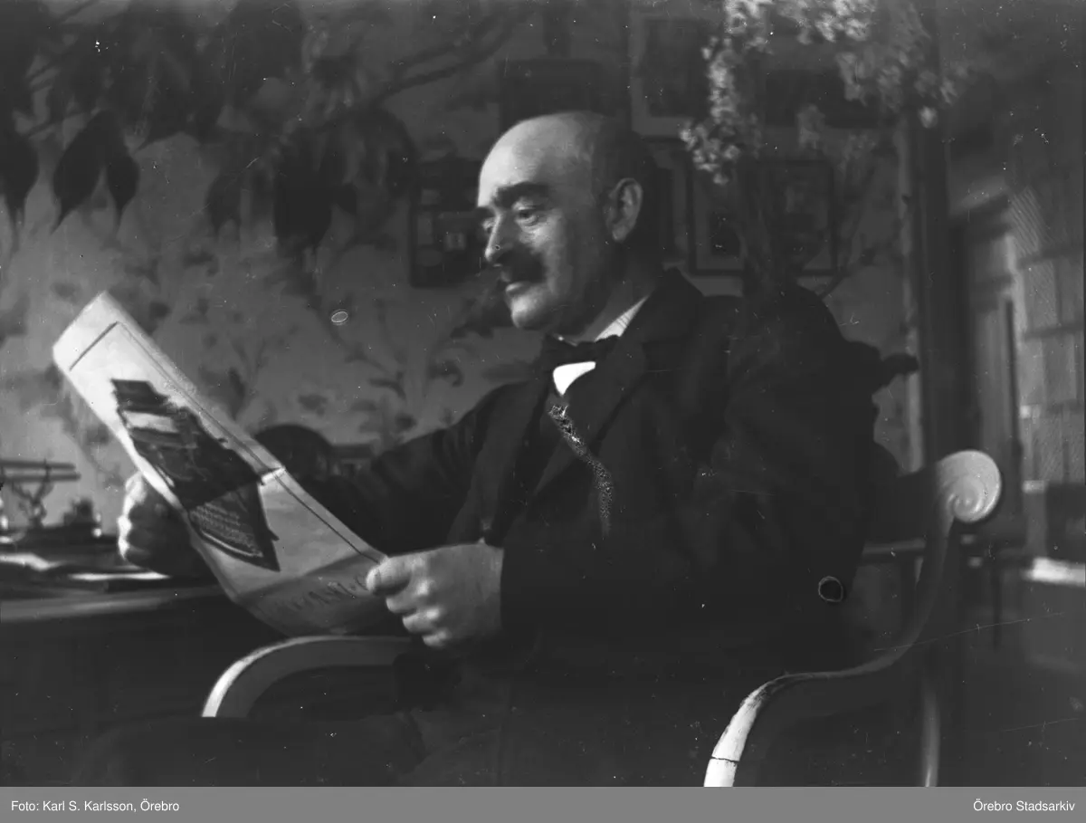 Levi Rickson läser tidningen på redaktionen, Norra Strandgatan, Klostergatan, 1920-tal