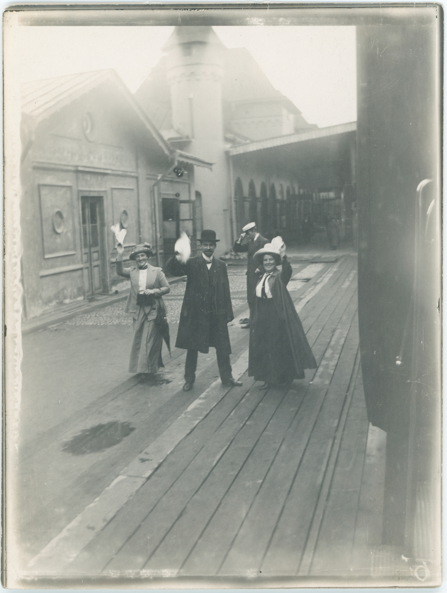 Avsked på Uppsala centralstation, en man och två kvinnor vinkar med vita näsdukar