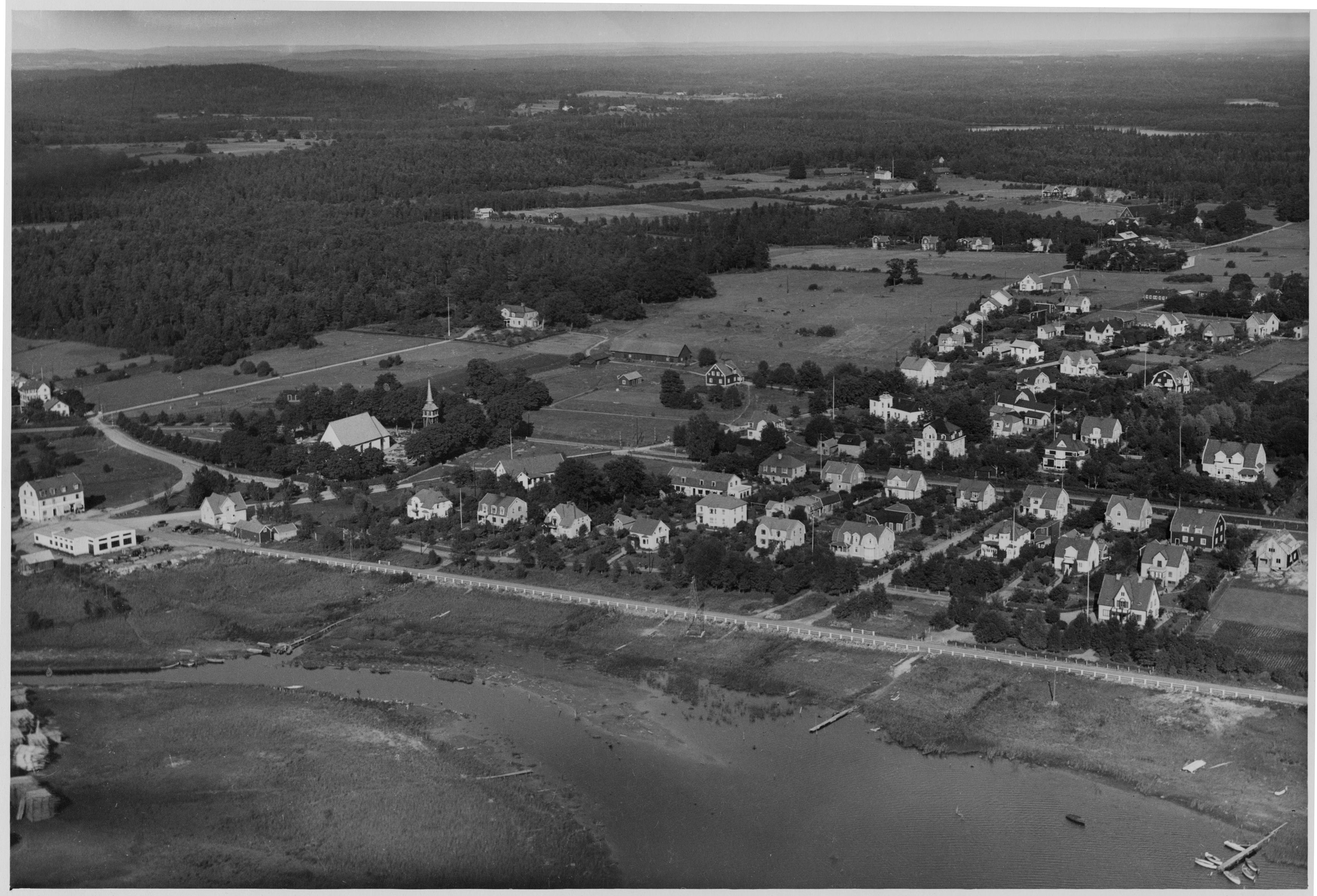 Flygfoto över kyrkan med omnejd. Från sydväst.