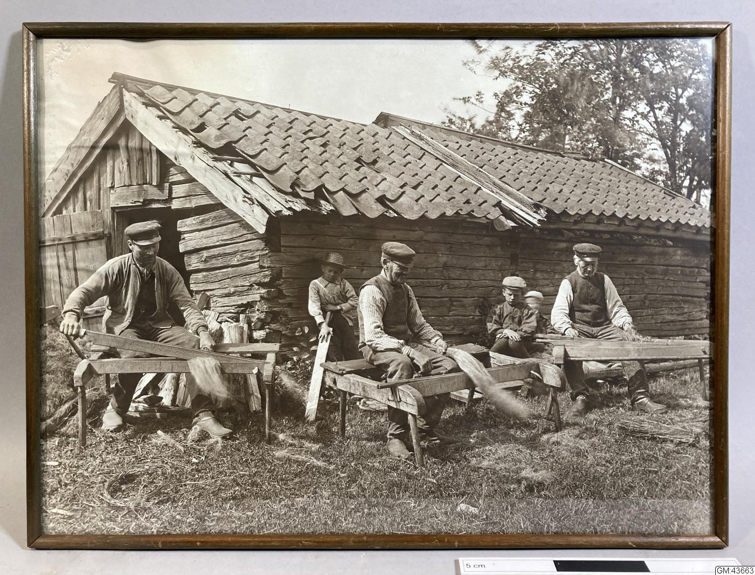 Fotografi visande linberedning, tre män som sitter vid varsin linbråka. I bakgrunden tre barn.