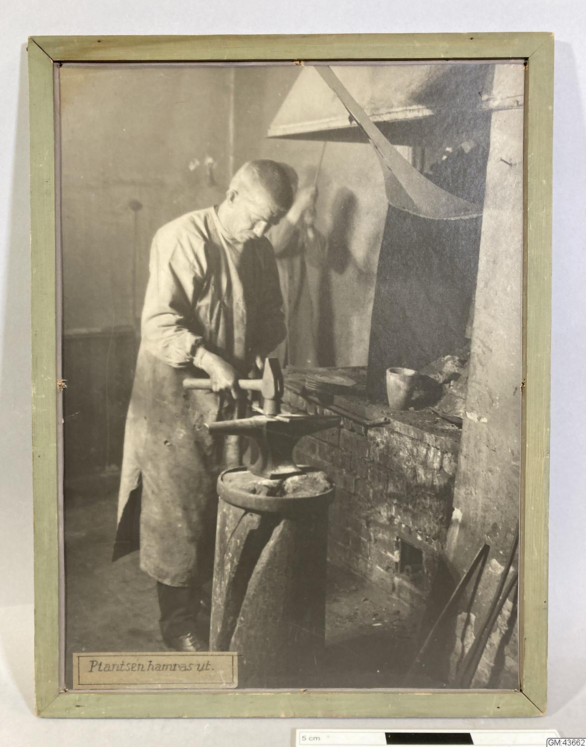 Fotografi föreställande guldsmed i Hallbergs verkstad i färd med att "hamra ut plantsen". Fotografiet ställdes ut på den Hantverkshistoriska avdelningen under Jubileumsutställningen 1923 i rummet för guldsmide se GhmD:1276. Hade då utställningsnummer 70 (som framgår av påskrift på baksidan i blyerts) som återfinns i jubileumspublikationen som "fotografi". Inramat i en grönmålad träram.