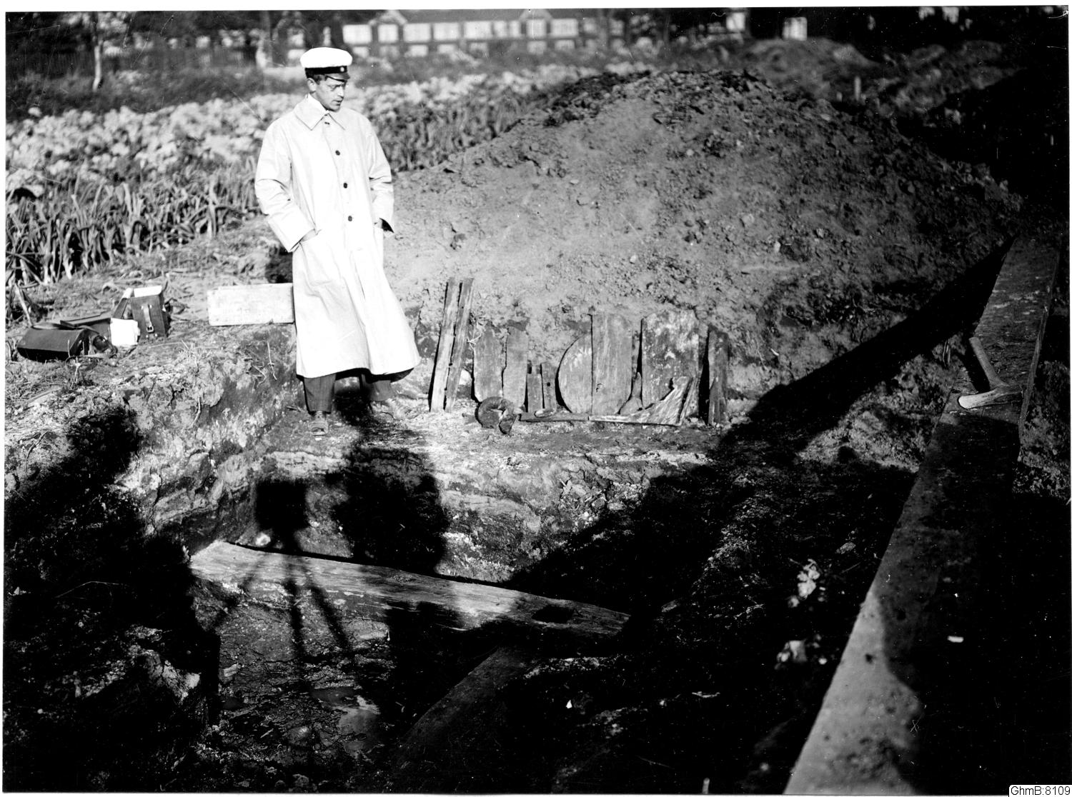 Utgrävning, Nya Lödöse. Foto av G. Lundström 1916. "Föremål från stolphuset jämte stockar åt öster. Sektion B.