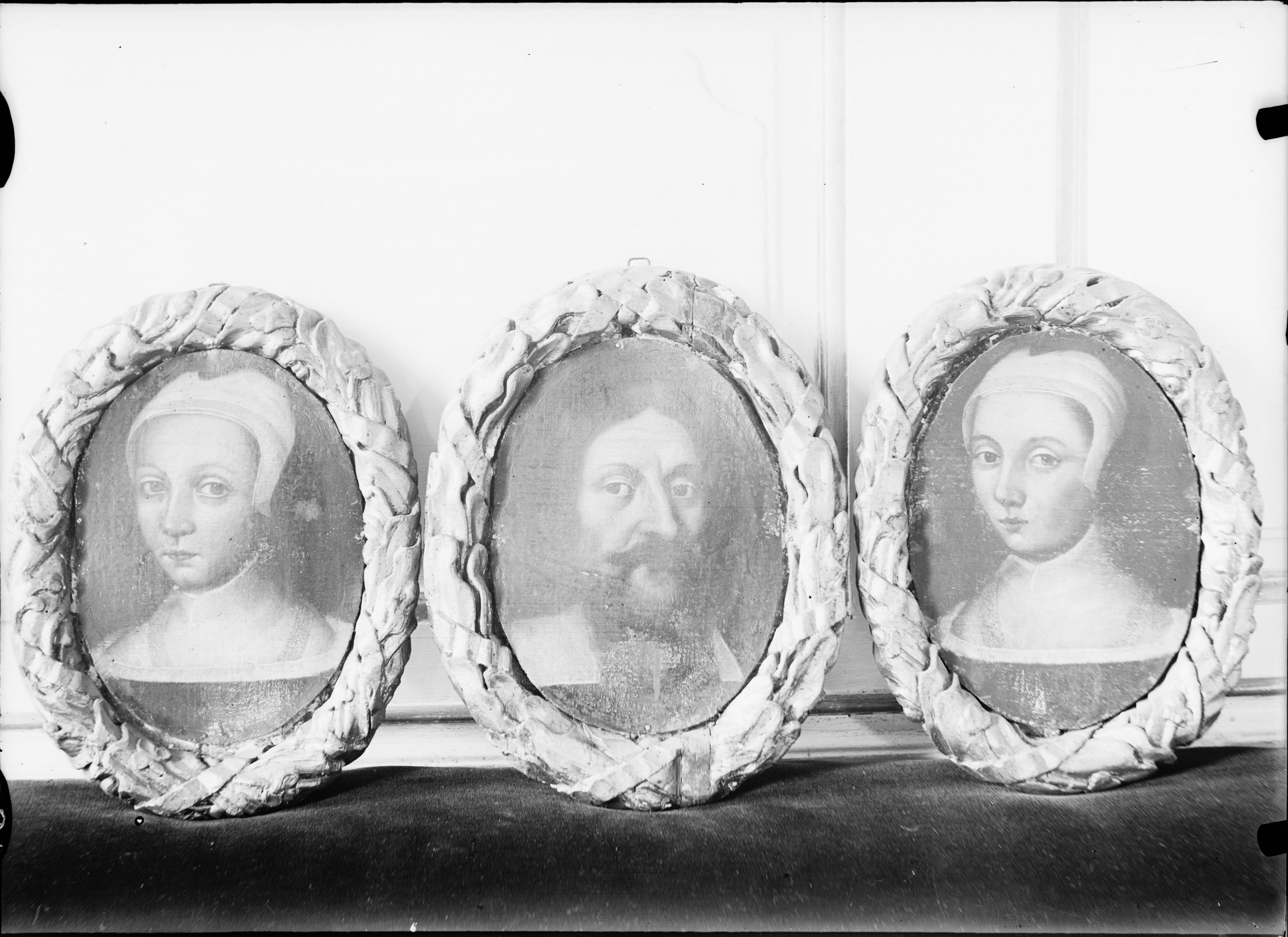 Porträtt föreställande kyrkoherden Markus Simming, 1674-1690, och dennes första och andra hustru, Sara Unonia Troilius och Anna Stjernman, tre stycken tavlor, ovala, ramarna snidade och förgyllda.