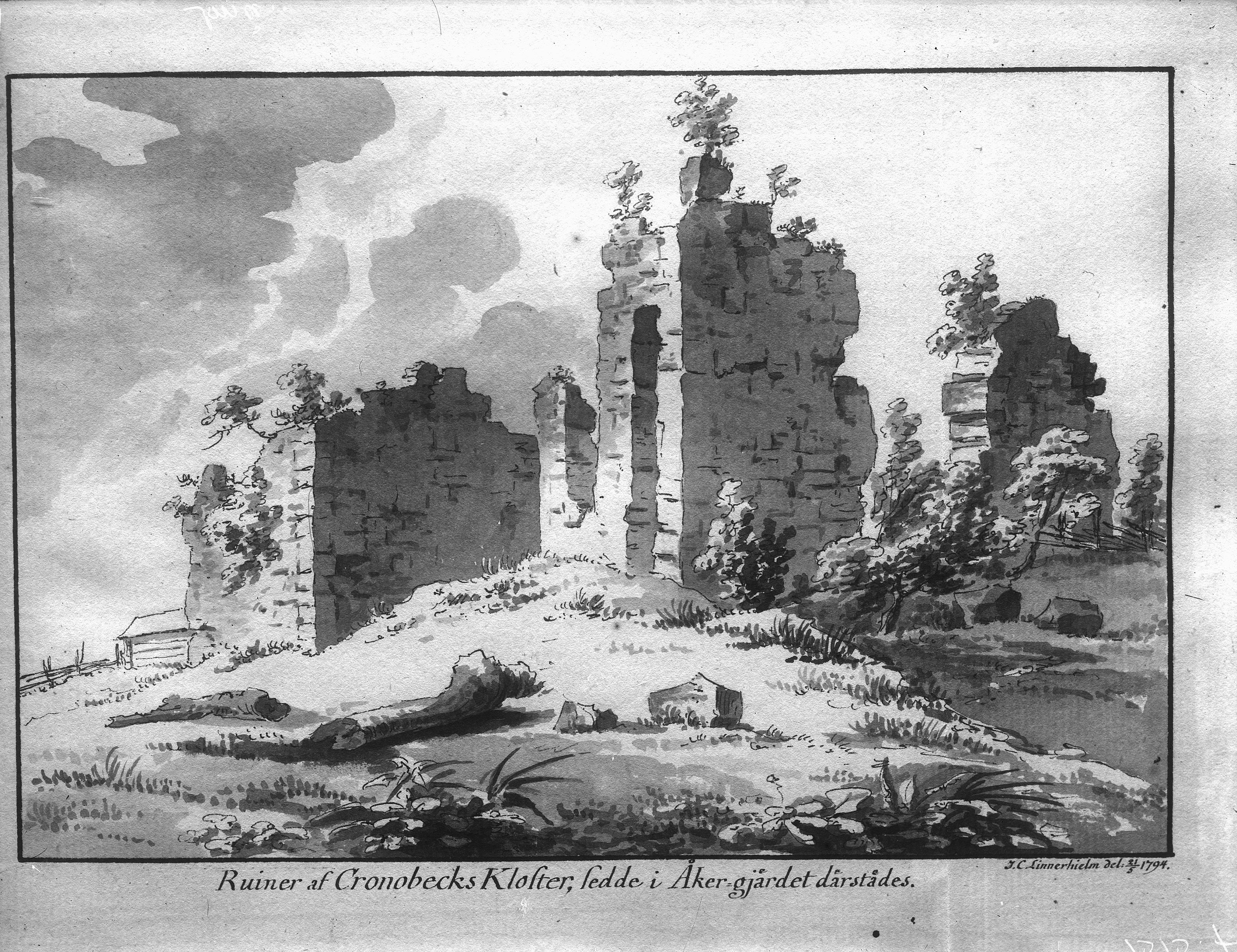 Klosterruinen år 1794. Foto efter tuschlavering av Linnerhjelm.