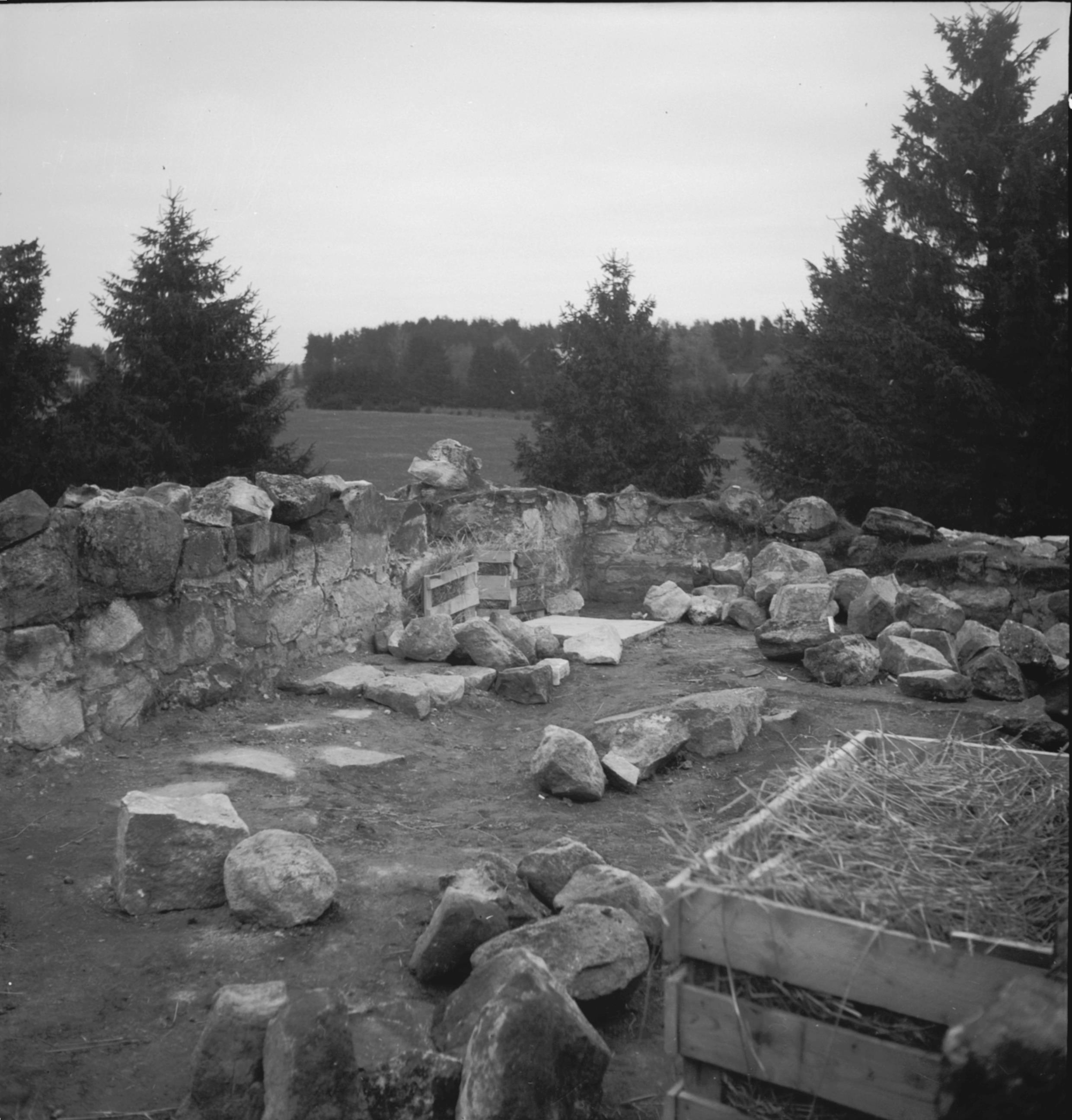 Kyrkoruinen, tegelmurade partier intäckta med halm.