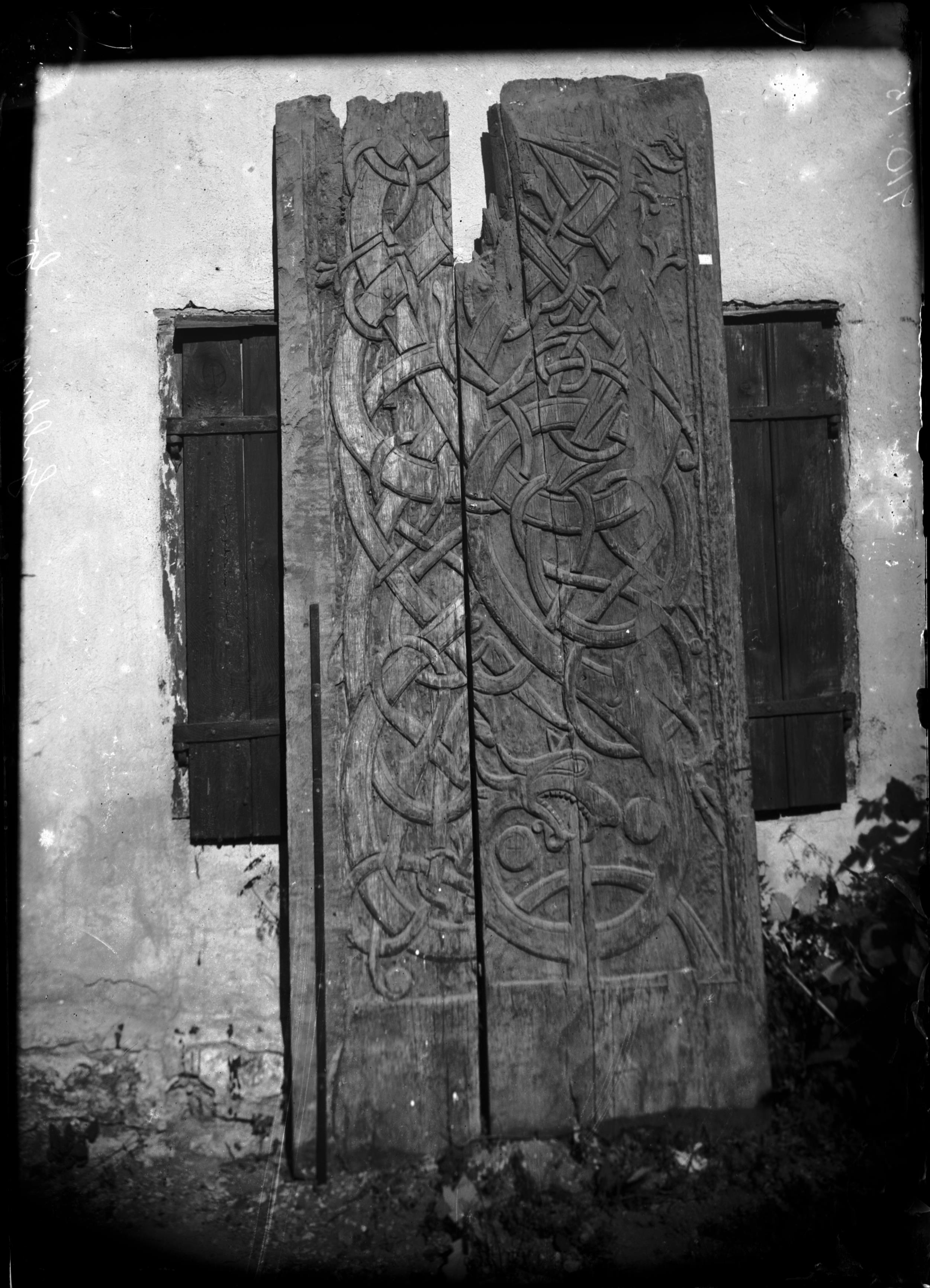 Ekplankor från gamla träkyrkan med rik dekor i plattrelief. På den högra ses Sigurd Fafnesbanes svärd nedifrån tränga in i drakens gom. 1000-talets mitt.