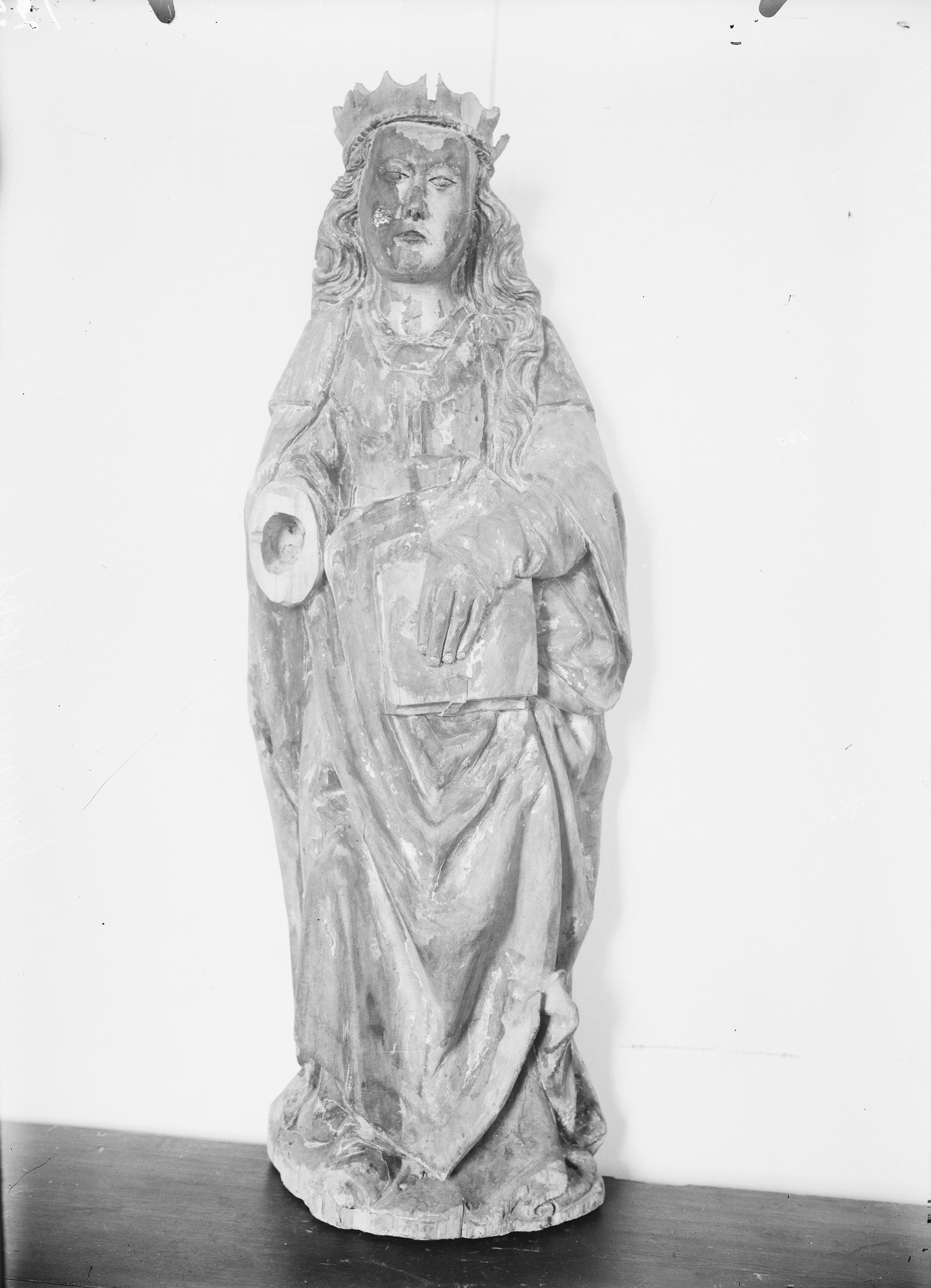 Skulptur, trä, kvinnligt helgon, från omkring 1500.