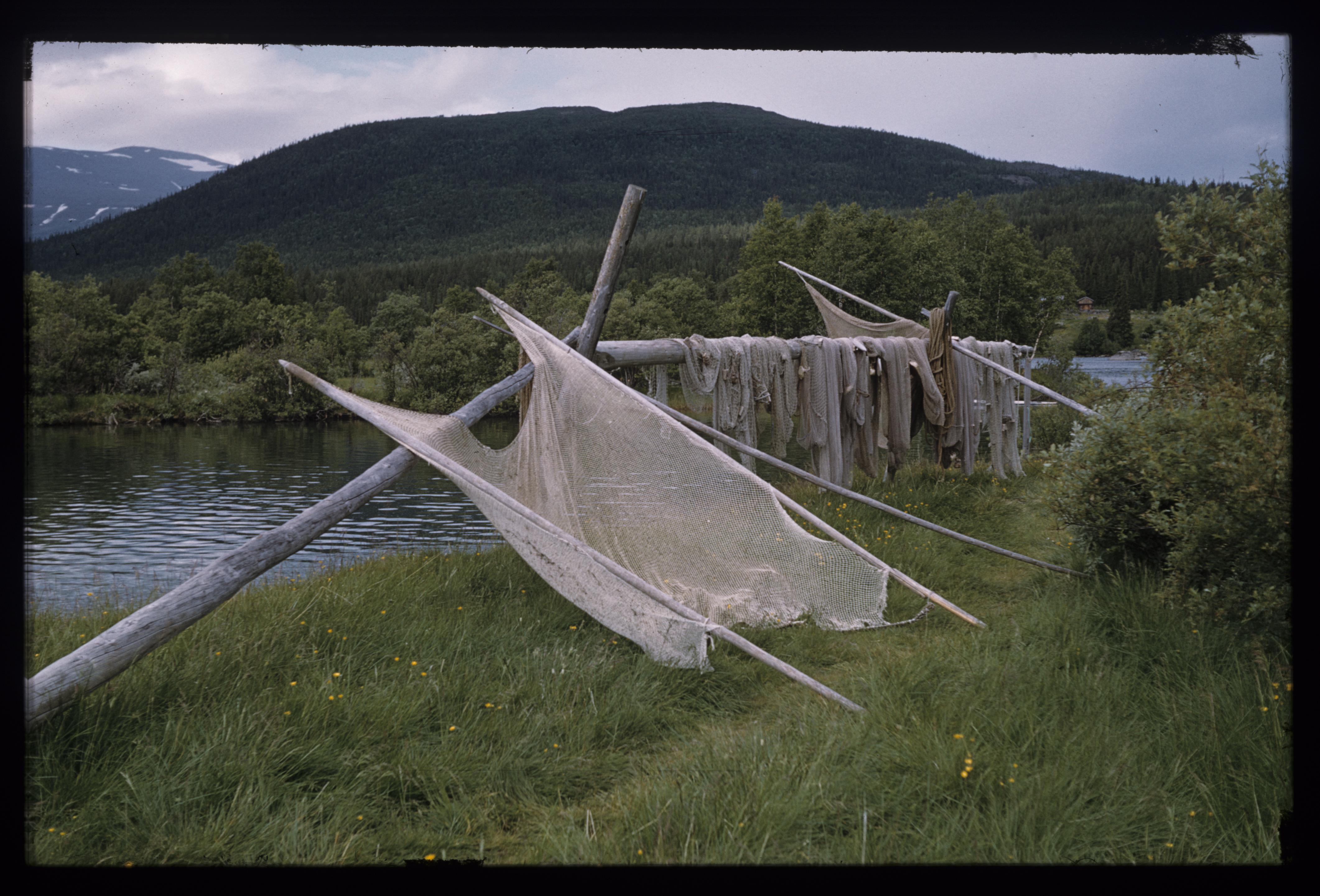 Upphängda fisknät på störar, så kallade nätgist. Vy mot nordväst och Prinskullen på fjällryggen Vallevare. 1732 gick Carl von Linné över Prinskullen på sin väg mot fjällen.