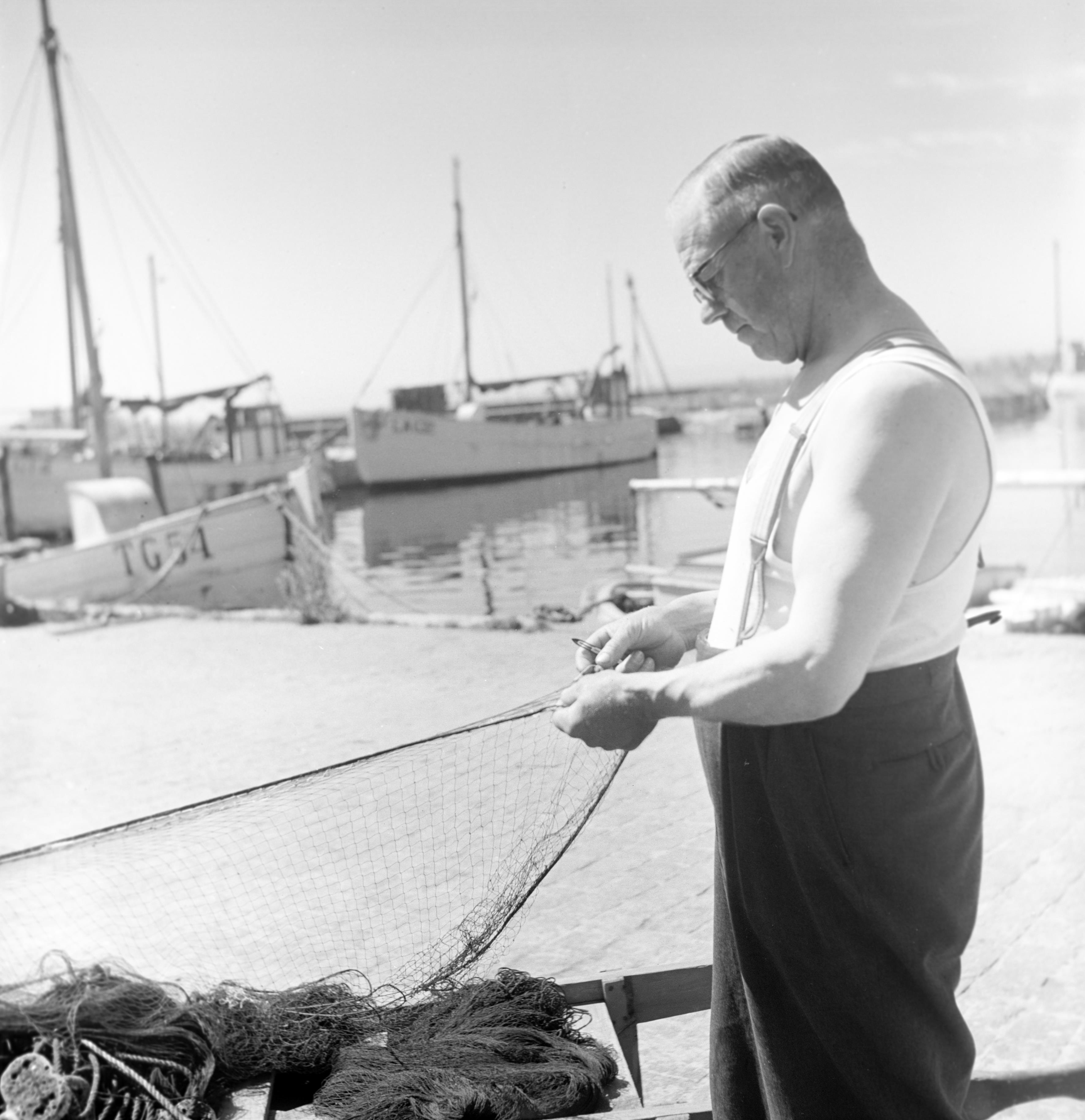 Beskrivning: Smyge läge vid Smygehuk. Fiskare preparerar fisknät. Fiskebåtar i bakgrunden. Bilden tagen på 1940-talet.