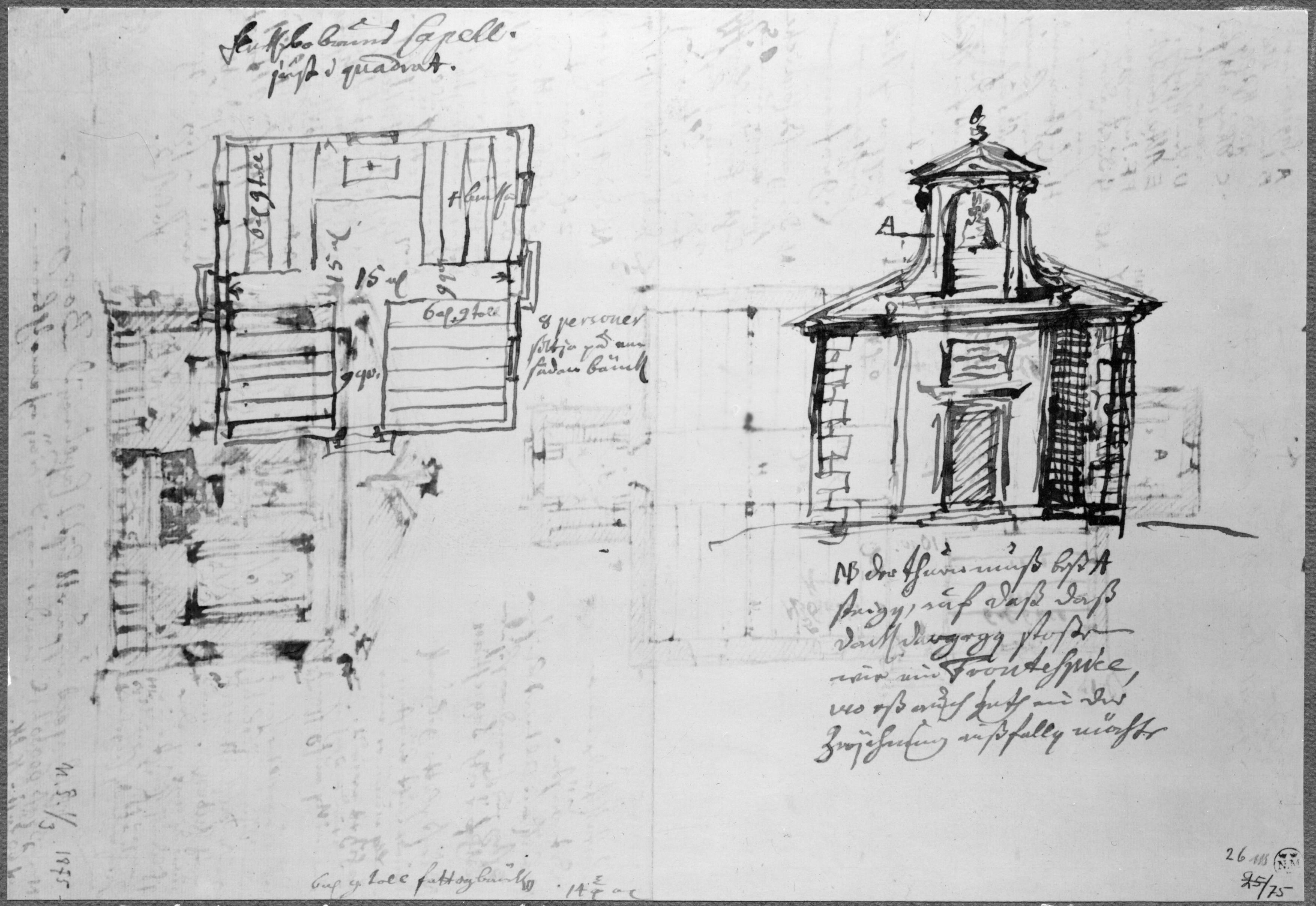 Ritning av kapellet, av Nicodemus Tessin d.y., omkring 1720. Ur Celsingska samlingen.