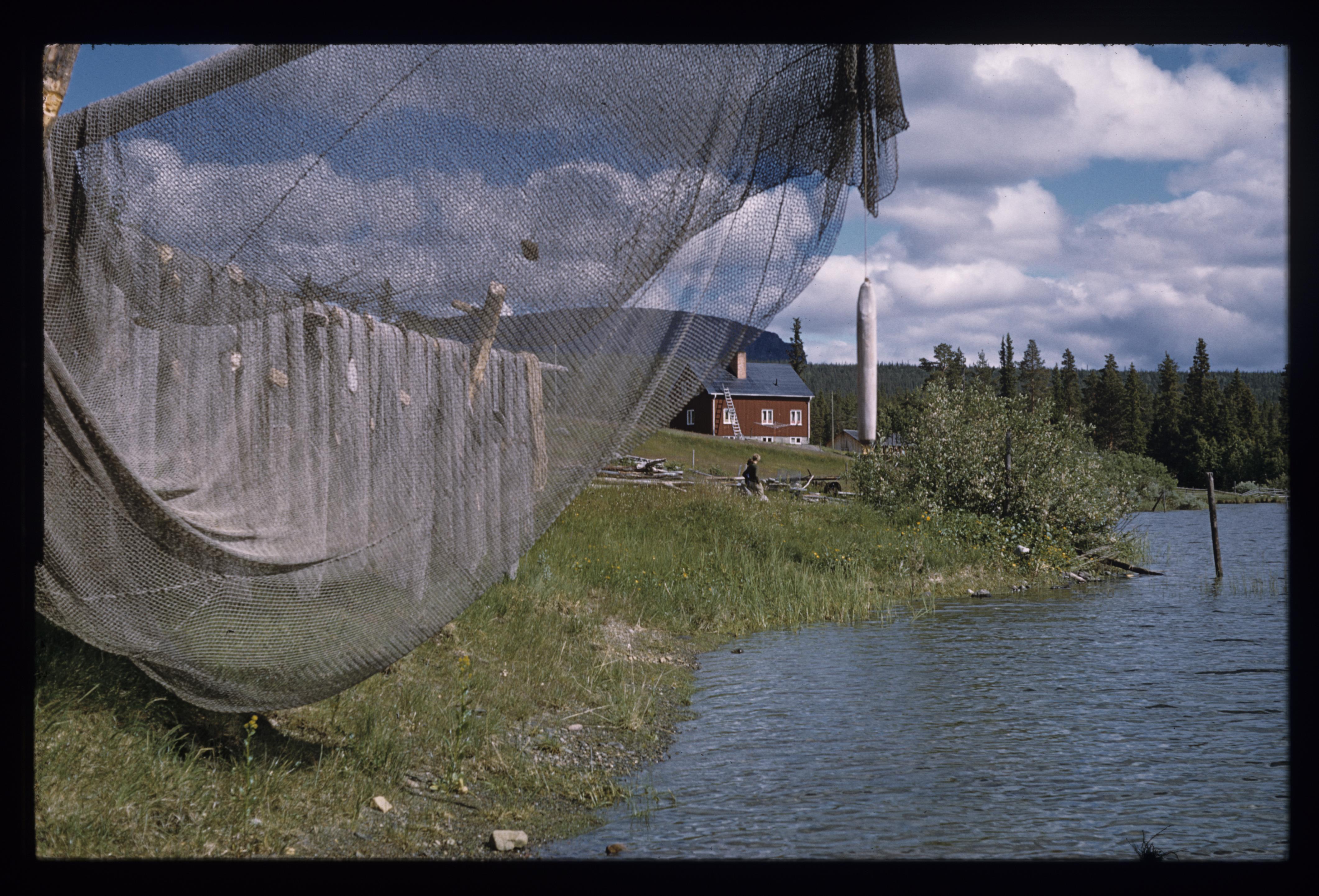 Upphängda fisknät på störar, så kallade nätgist. Vid Årrenjarka, mot öster.