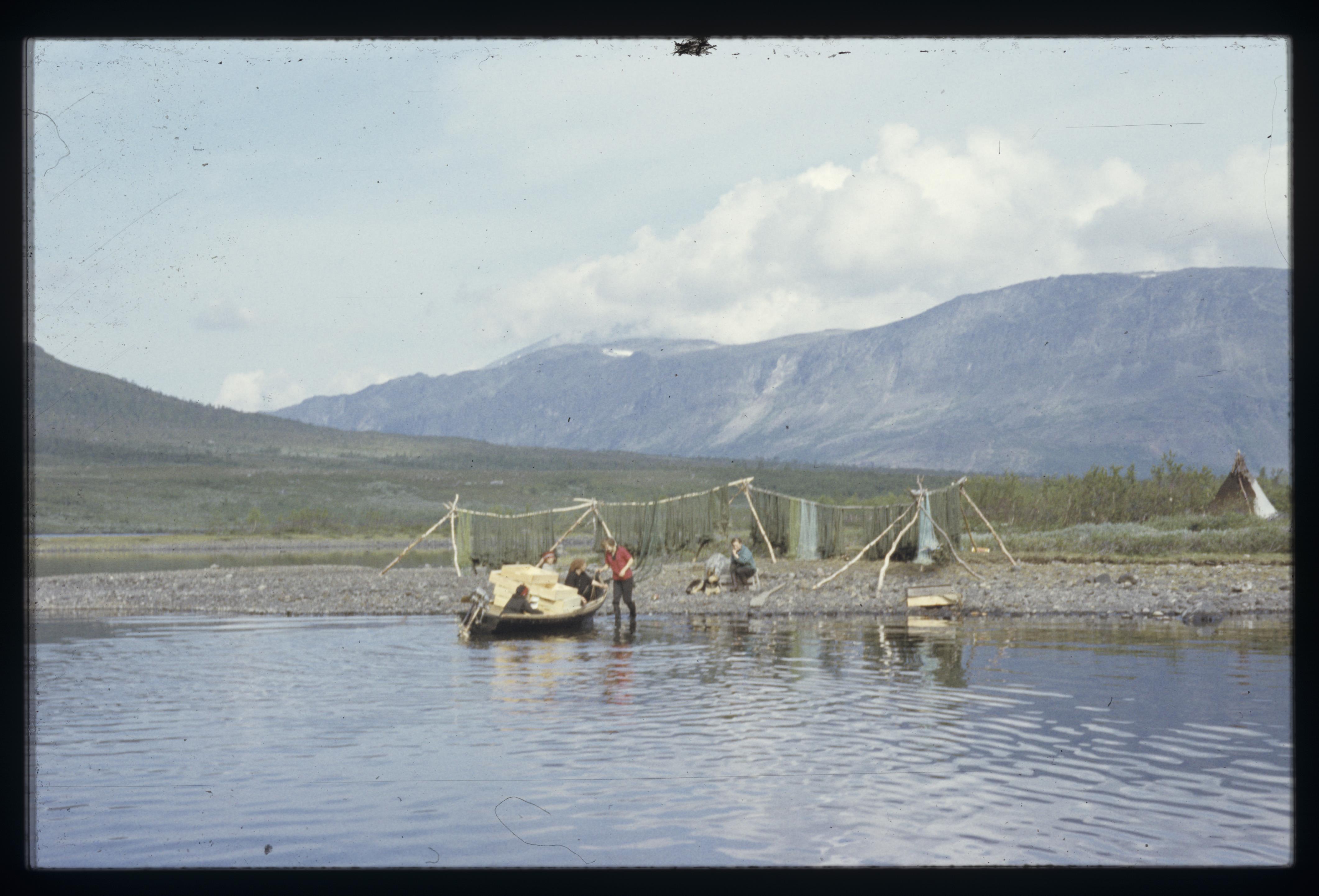Sameviste. Fisklådor och fisknät på störar, så kallade nätgist, vid stranden. Laponia.