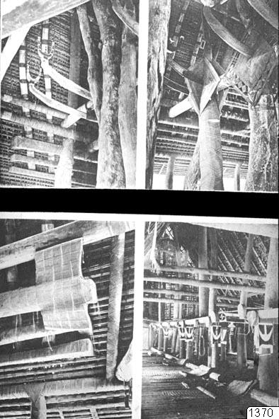 Interiörer av klubbhus. Bilden ned t.h. från byn Maki, de övriga från byn Valavet. Egerbnisse der Südsee-Expedition 1908-1910. II B, Bd. 2: W. Müller: Yap I. Hamburg 1917. Tafel 49 vid p. 152.