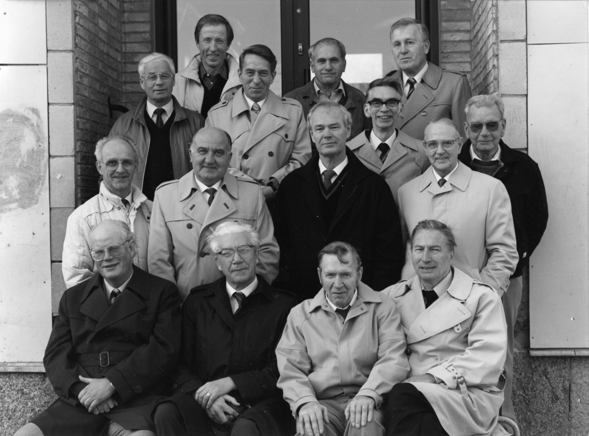 Gruppbild på 15 män uppställda i en trappa. De har ytterkläder på sig. Sammanhanget är inte känt.