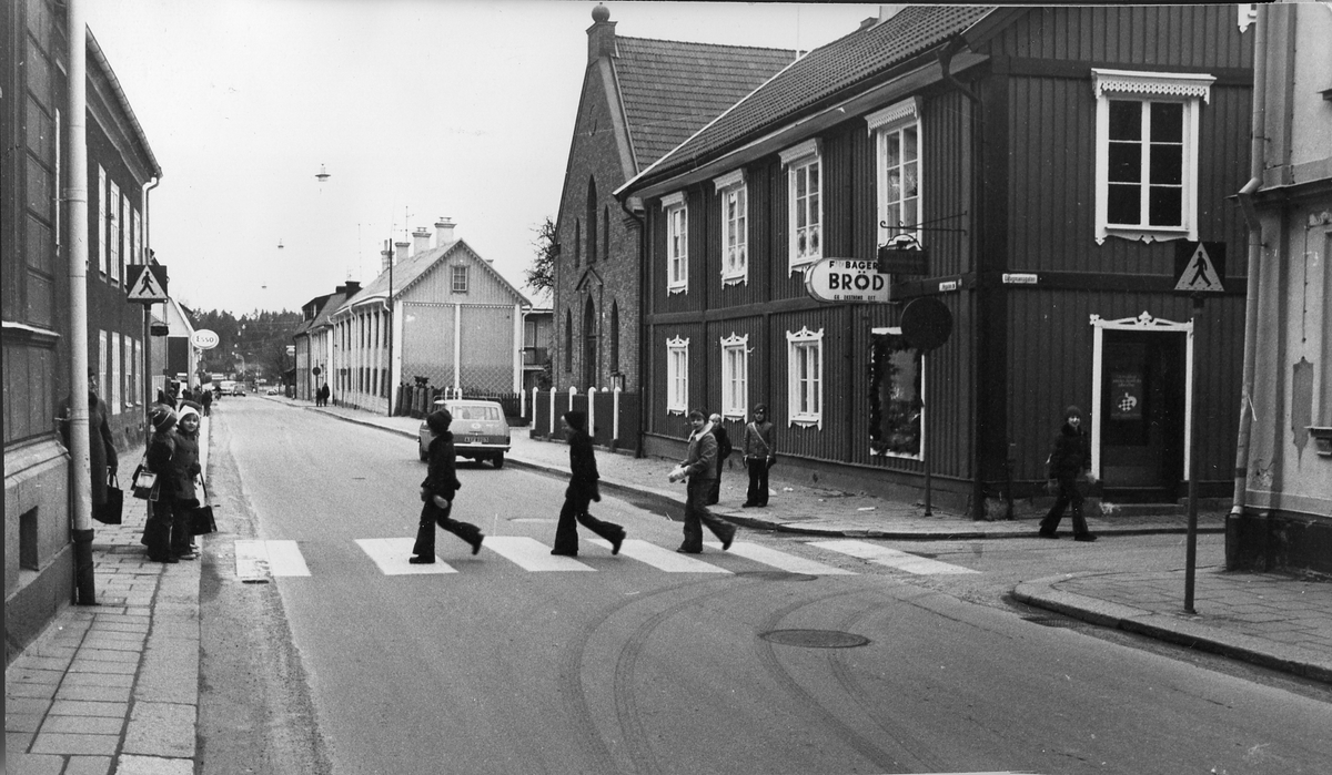 Bageri på Nygatan, barn på övergångsstället. En bil är parkerad utanför Missionskyrkan. En ESSO-mack till vänster.