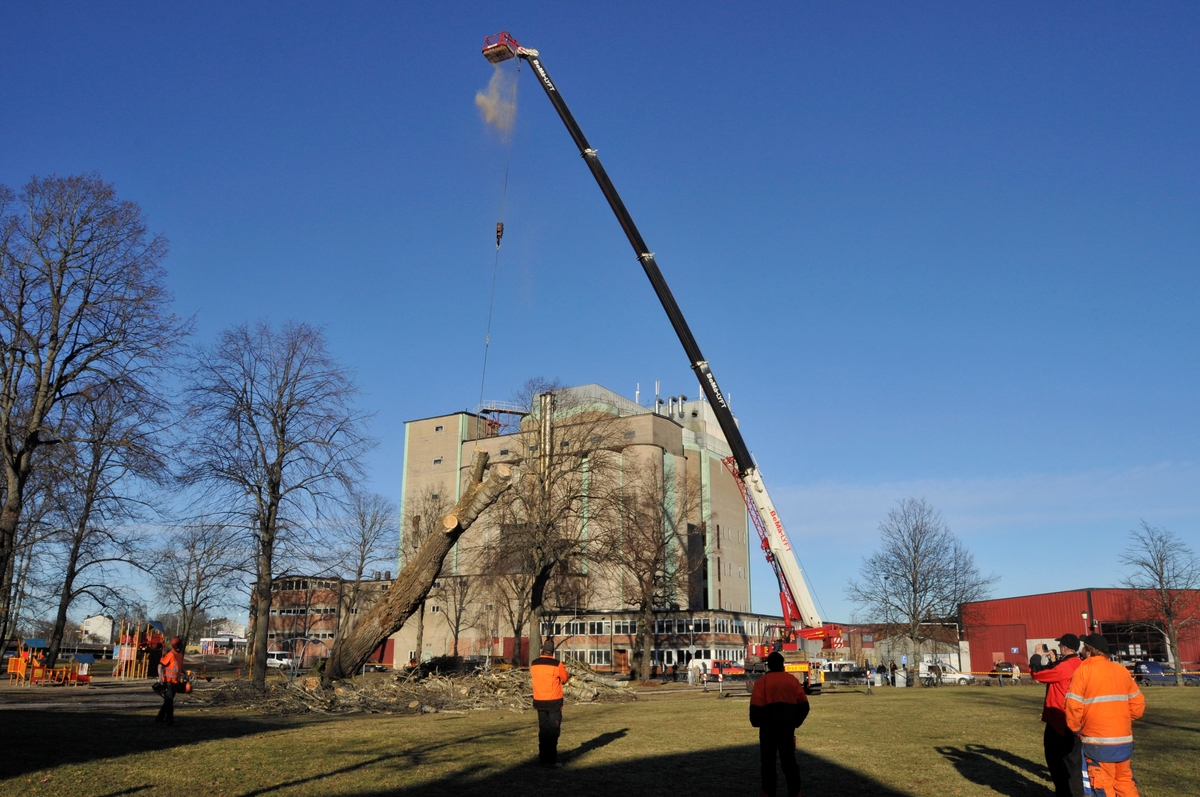 Fällning av den stora gråpoppeln i Bergmanparken. Trädet läggs till marken. Lyftkran och människor i arbete.