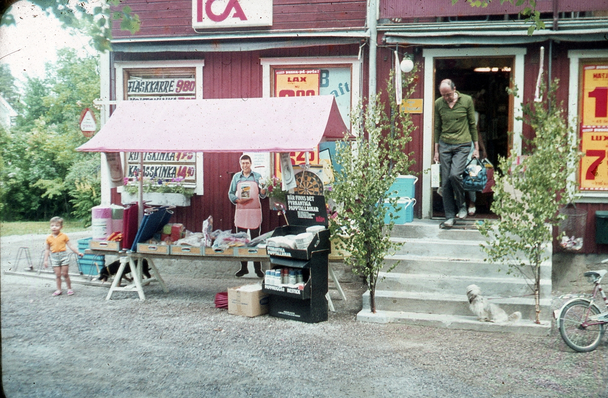 ICA-butiken Lövsta Handel. En man är på väg ut med en matkasse i varje hand. Trappan är lövad. En liten hund är bunden vid en av björkarna. En pojke står intill ett torgstånd där diverse campingutrustning säljs. Vid cykelstället är en liten, svart hund bunden. Affärens skyltfönster är täckta av reklamaffischer. Det är sommar.