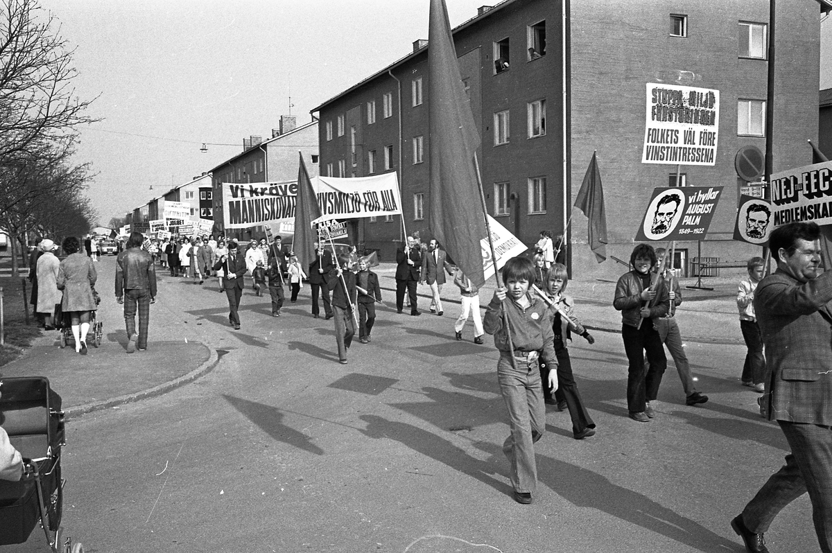 Demonstration på första maj. Människor tågar med plakat, fanor och banderoller.