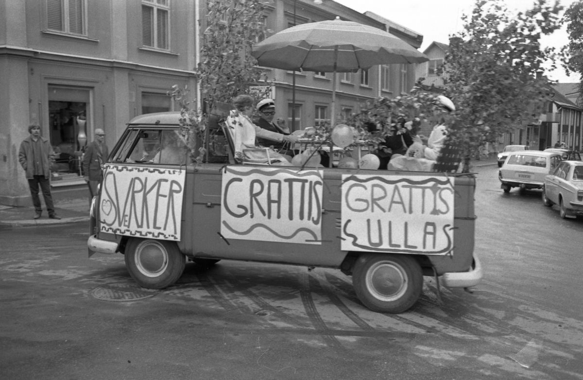 Här skjutsas studenterna Sverker och Ulla i lövad pick-up