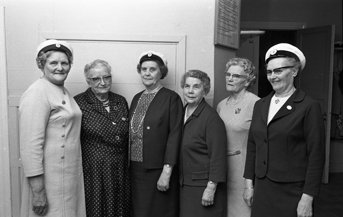 Sex äldre kvinnor står uppställda för fotografering. Tre av dem bär skärmmössor med särskilt emblem. Lokalen är inte identifierad.