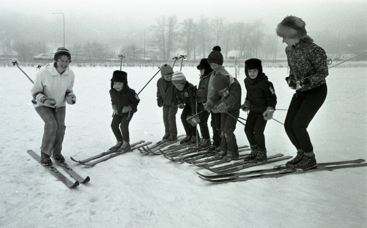 Avslutning på skidskola för barn. Två skidlärare och sju barn. Anita Gustafsson längst till höger.