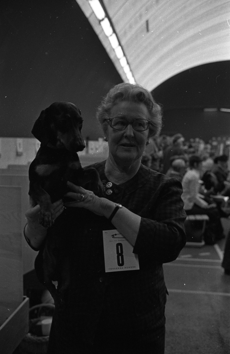 Hundutställning. Matte med släthårig, svart tax. Kvinnan har en nummerlapp märkt med siffran åtta. Bakom henne ses publik sittande på bänkar.