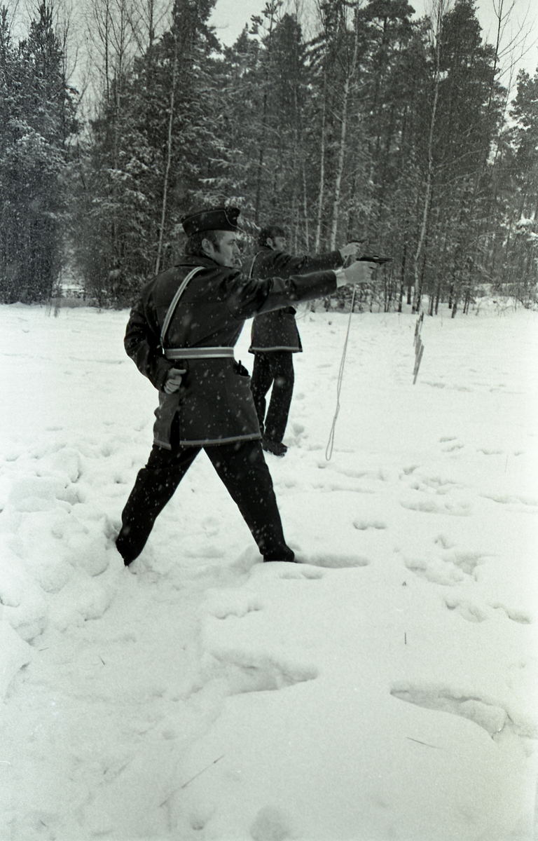 Två polismän, i uniform, skjuter med pistol. Det snöar. Skog i bakgrunden.