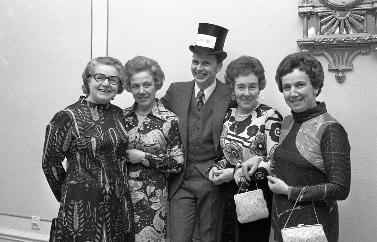 Damerna är klädda i känningar och har aftonväskor på armen. Yngvar har en stormhatt med texten "Alltid redo"