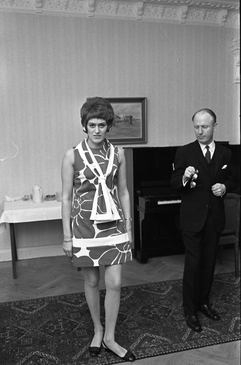 TBV ordnar modevisning. Här är mannekängen Gunilla Magnusson i en mönstrad, kort klänning med sjal. Sture Melander, från Öhrman & Melander, är konfrencier.