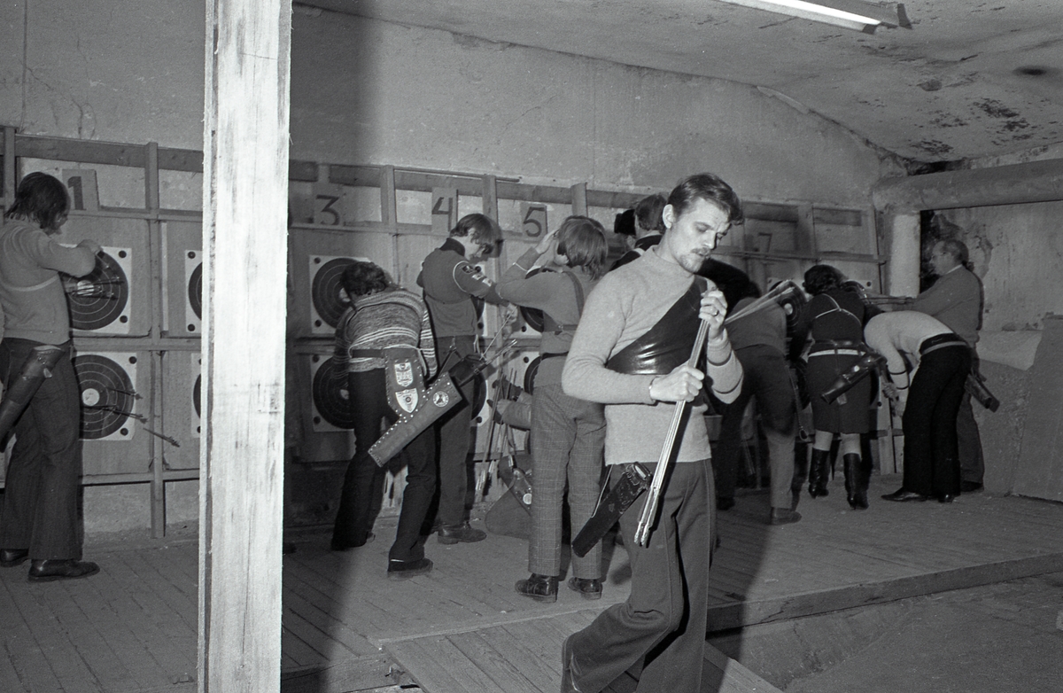 Inomhusträning hos Arboga Bågskytteklubb. Skyttarna räknar poäng på sina måltavlor. Var och en har sitt koger hängande på höften. Lokalen ser ut att vara i en källare.