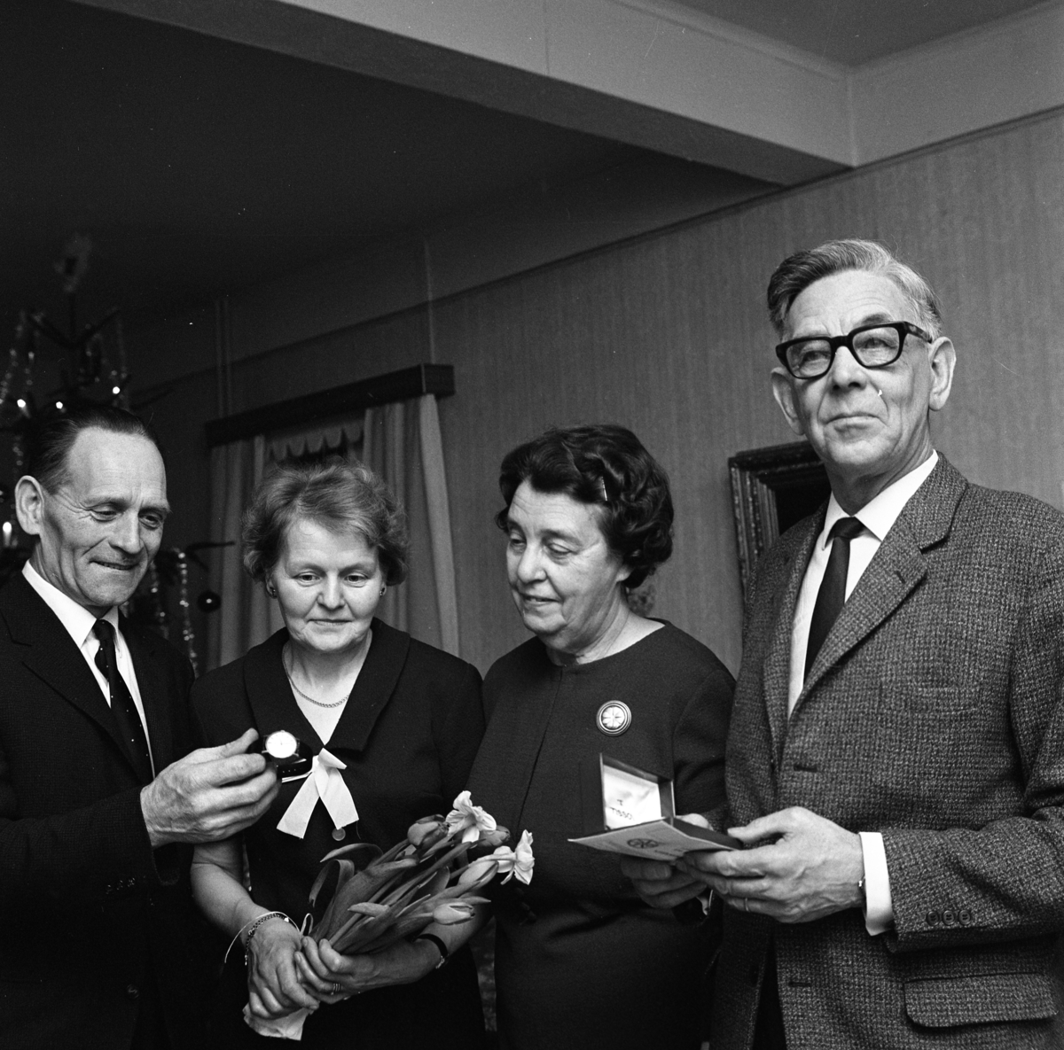 Einar Larsson i Hamre har fått en armbandsklocka. En kvinna håller i en blombukett.