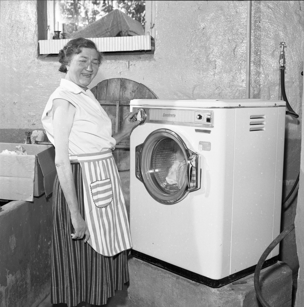 Kvinna, iklädd förkläde, står i källaren intill en ny tvättmaskin.