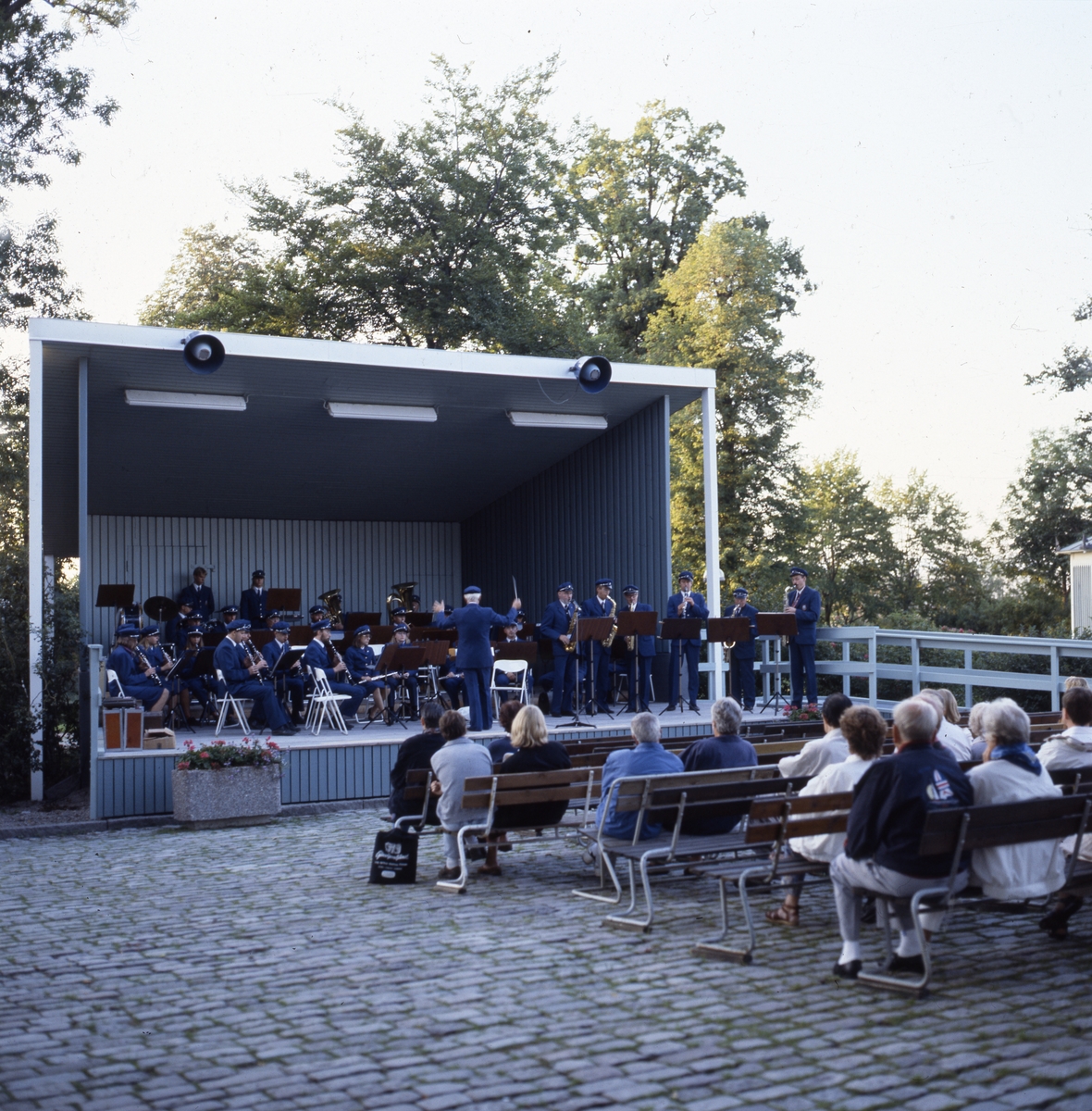 Arboga Blåsorkester uppträder för publik i Ahllöfsparken.
