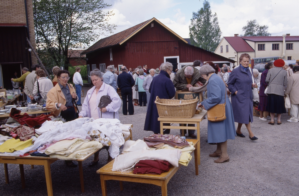Auktion. Bord är uppställda på grusplanen. På borden ligger diverse textilier till beskådande. Många intresserade människor.
