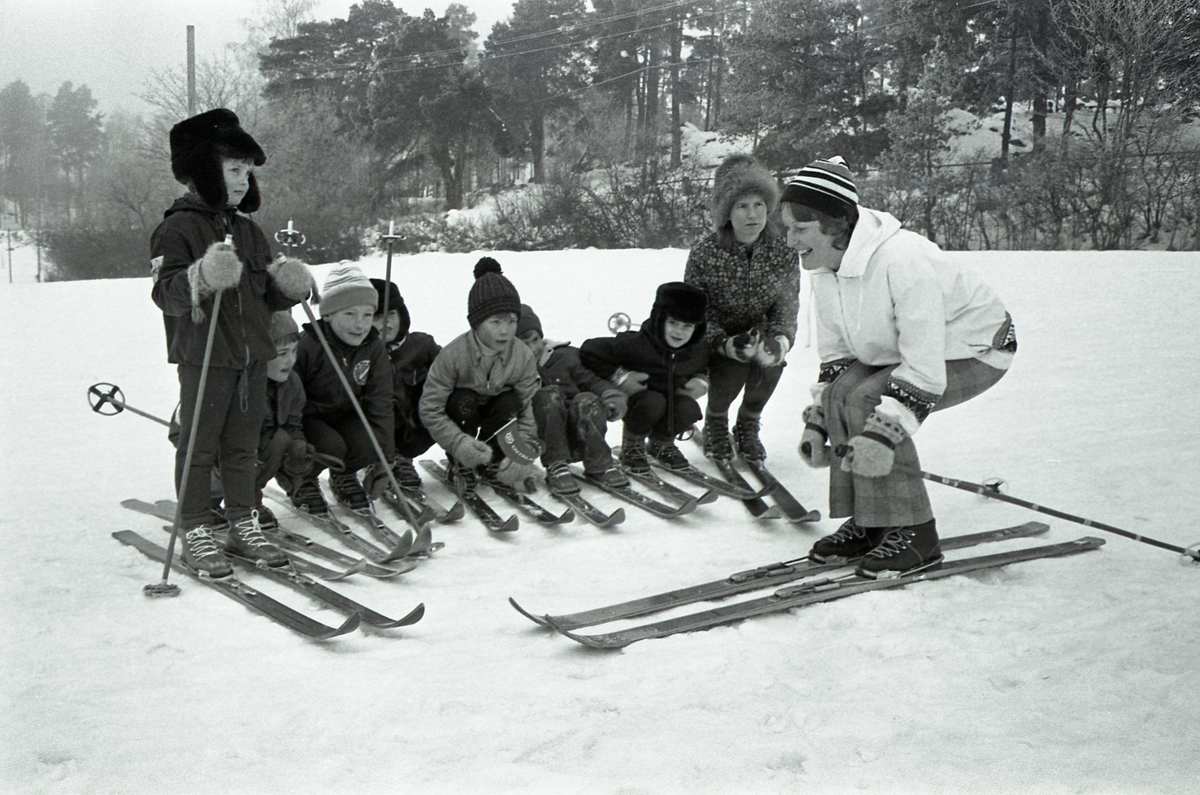 Två kvinnliga skidlärare och sju barn. Anita Gustafsson är skidläraren i spräckliga jackan.
