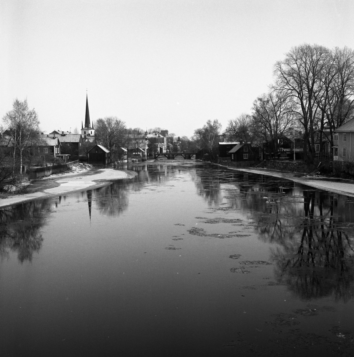 Utsikt från Strömsnäsbron. Ågårdar söder och norr om Arbogaån. Kapellbron mitt i bild. Heliga Trefaldighetskyrkan till höger och brandstationen anas bakom träden. Det är vinter. Isskärvor på ån.